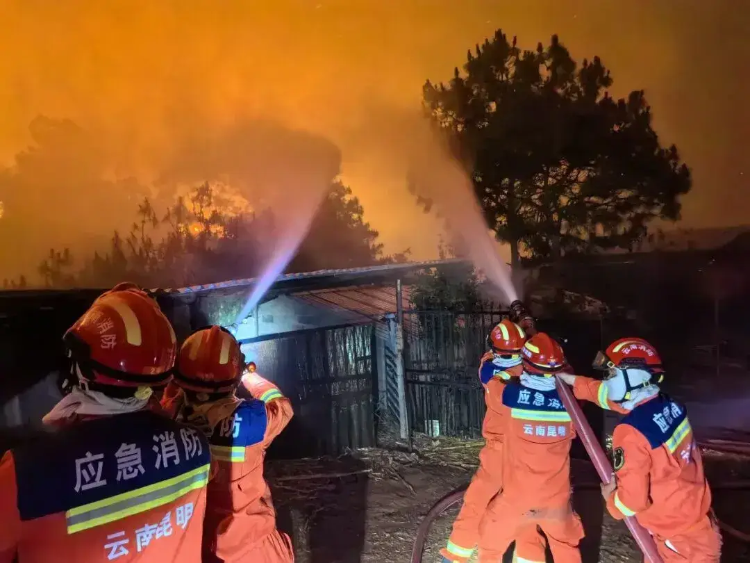 在初期火势蔓延的东南沿线方向,部分建筑距离火场较近,昆明支队投入38辆消防车,铺设水带干线3.3公里,以水灭火,扑灭火线2.4公里,清理复燃火点101处,有效控制了火势蔓延。
