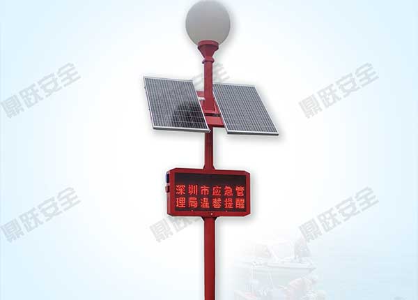 鼎跃安全的太阳能台风预警宣传信号杆DY-SEE-GTF300W。它不是简单的“立一根杆子、装一盏灯”,而是把预警、宣传、监测、调度整合在一起,形成一套更贴近一线的智能化防灾单元。这套设备首先解决的是“看得见”。顶部灯球可对应台风预警等级进行颜色变化,红、橙、黄、蓝、白五色联动显示,让现场人员即使在远距离、低能见度环境下,也能快速判断风险等级,不需要复杂理解,看到颜色就能做出反应。